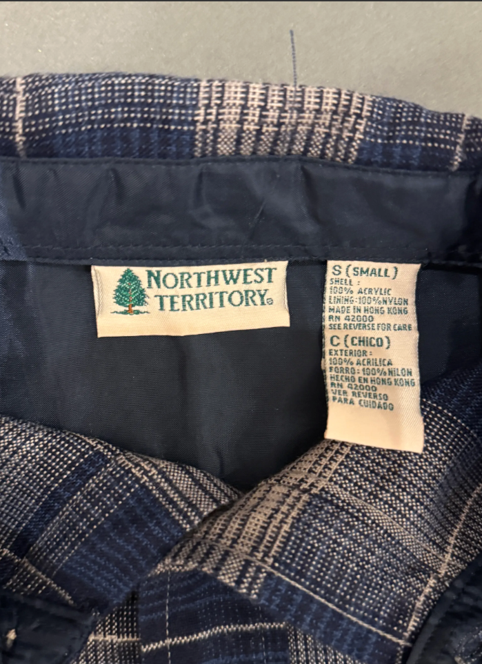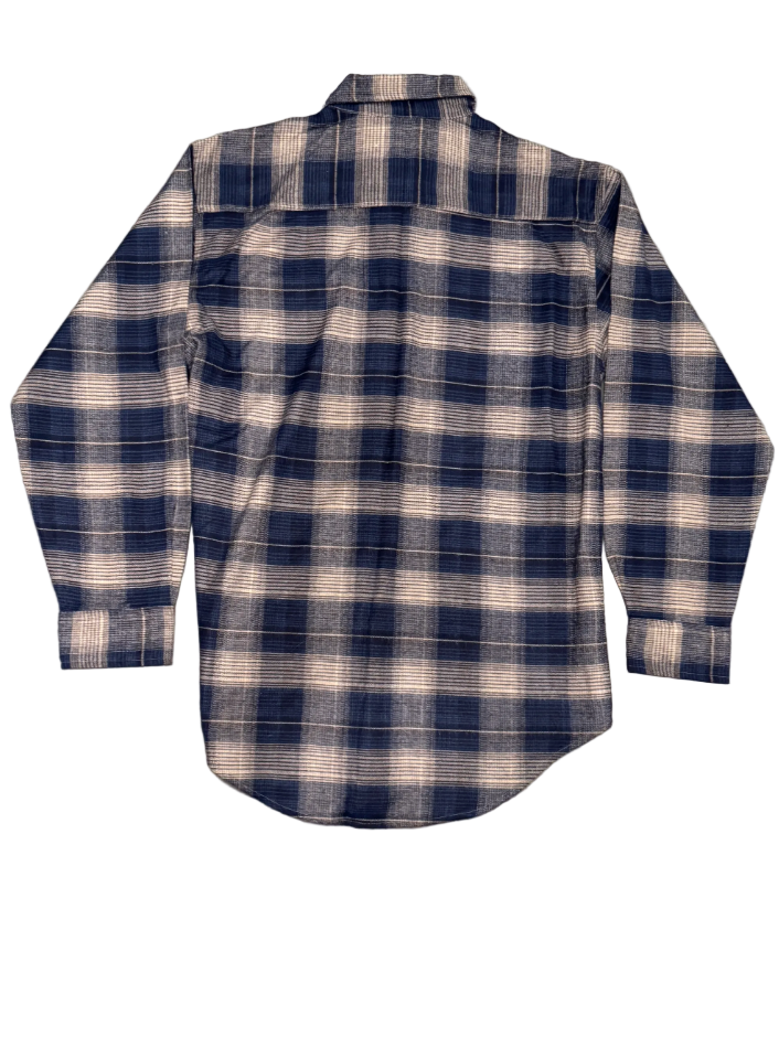 Vintage Dark Blue & Tan Plaid Insulated Flannel Jacket Rugged vintage style with practical warmth, ideal for outdoor chores or protesting.