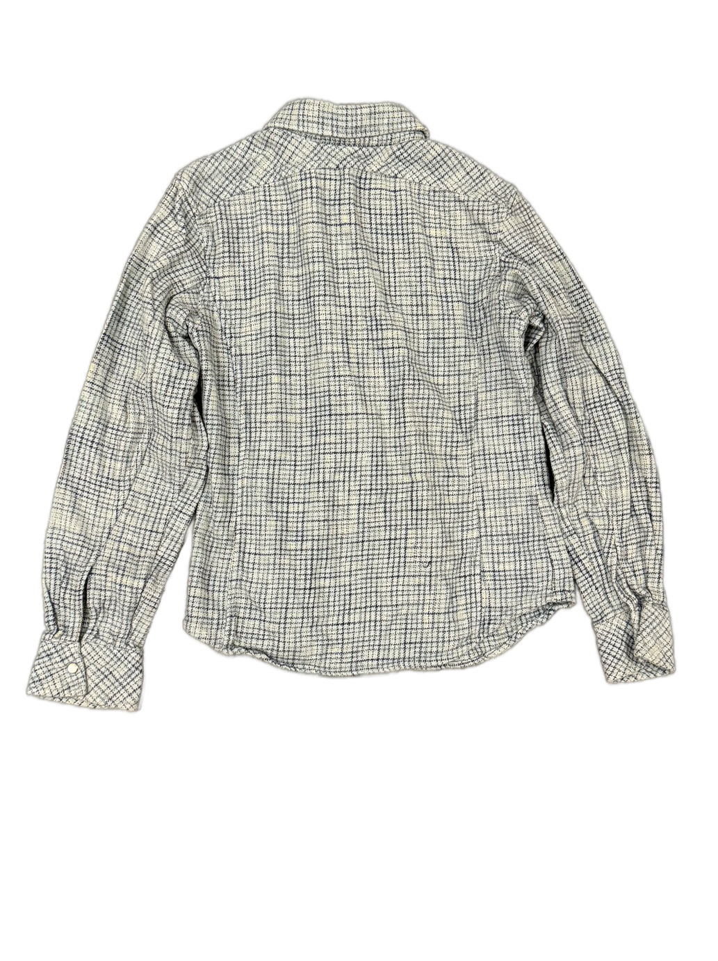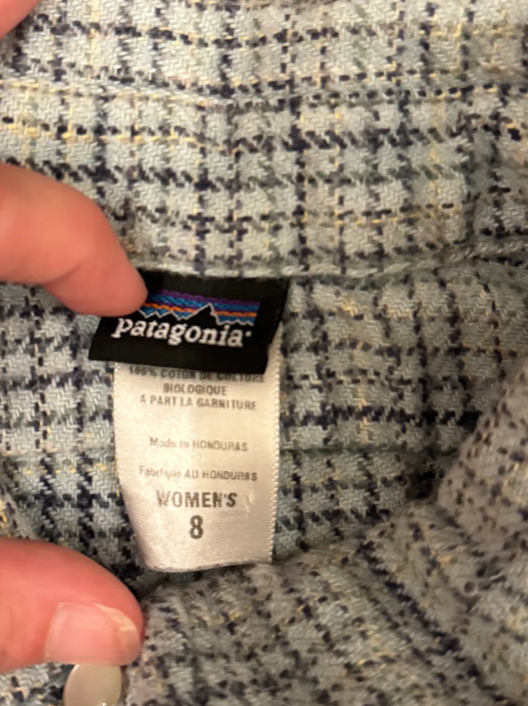 Women's Snap Front Flannel Light blue with gold & black micro-plaid pattern this shirt lives up to the Patagonia brand. Mother-of-pearl snap-front closure, wear it as an over-shirt or, button it up to the chin like a trad-wife who's still into it.